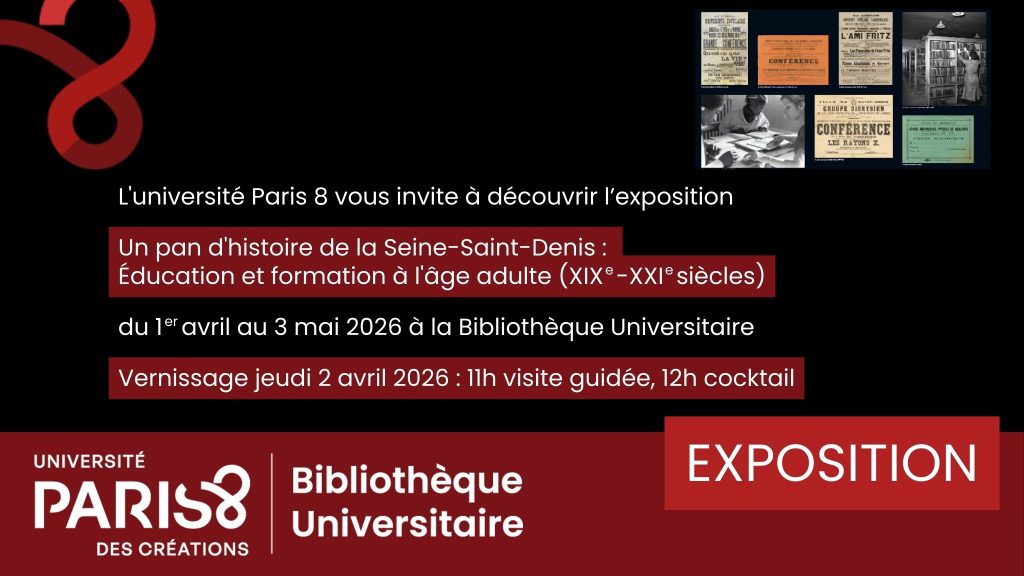 Après avoir été présentée à la MSH Paris Nord (18 janvier-27 juin 2024) puis aux Archives départementales de la Seine-Saint-Denis à Bobigny (13 février-mai 2025) l’exposition Un pan d’histoire de la Seine-Saint-Denis. Éducation et formation à l’âge adulte (XIXe-XXIe siècles) sera montée à la bibliothèque universitaire de Paris 8 du 1er avril au 3 mai 2026.
