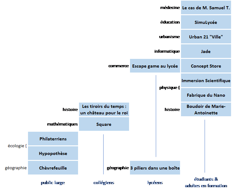 La plupart des participants étaient des enseignants et des formateurs, dans différents contextes, mais cette journée a aussi bénéficié de la participation de game designers professionnels qui collaborent régulièrement avec des enseignants. Au total 15 projets ont été présentés, ayant abouti à des jeux de type jeu de plateau, jeu de cartes, escape game ou jeu de rôles, utilisés dans des situations pédagogiques ou de médiation scientifique, dans des domaines et pour des publics variés.