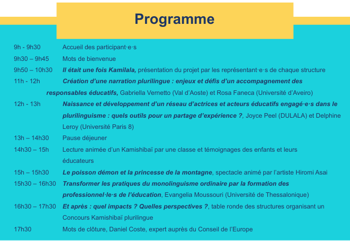 Équipe de pilotage de la journée de dissémination du projet Erasmus+ Kamilala : « Les kamishibaï plurilingues en contexte éducatif : retours, enjeux et perspectives », le 1er juillet 2022 à l’Université Paris8