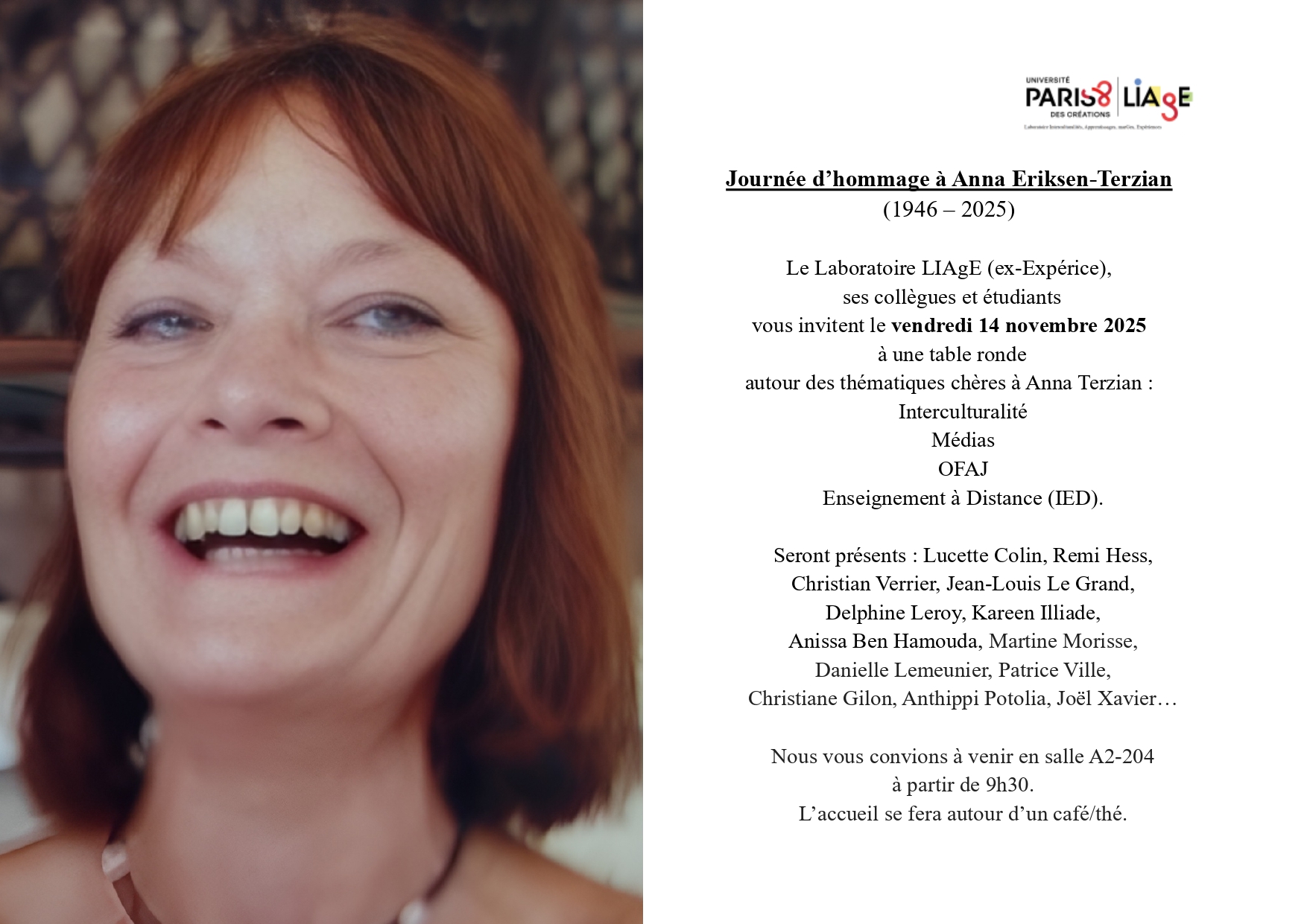 En savoir +Journée d’hommage à Anna Eriksen-Terzian (1946 – 2025) À l’université Paris8, Le vendredi 14 novembre...